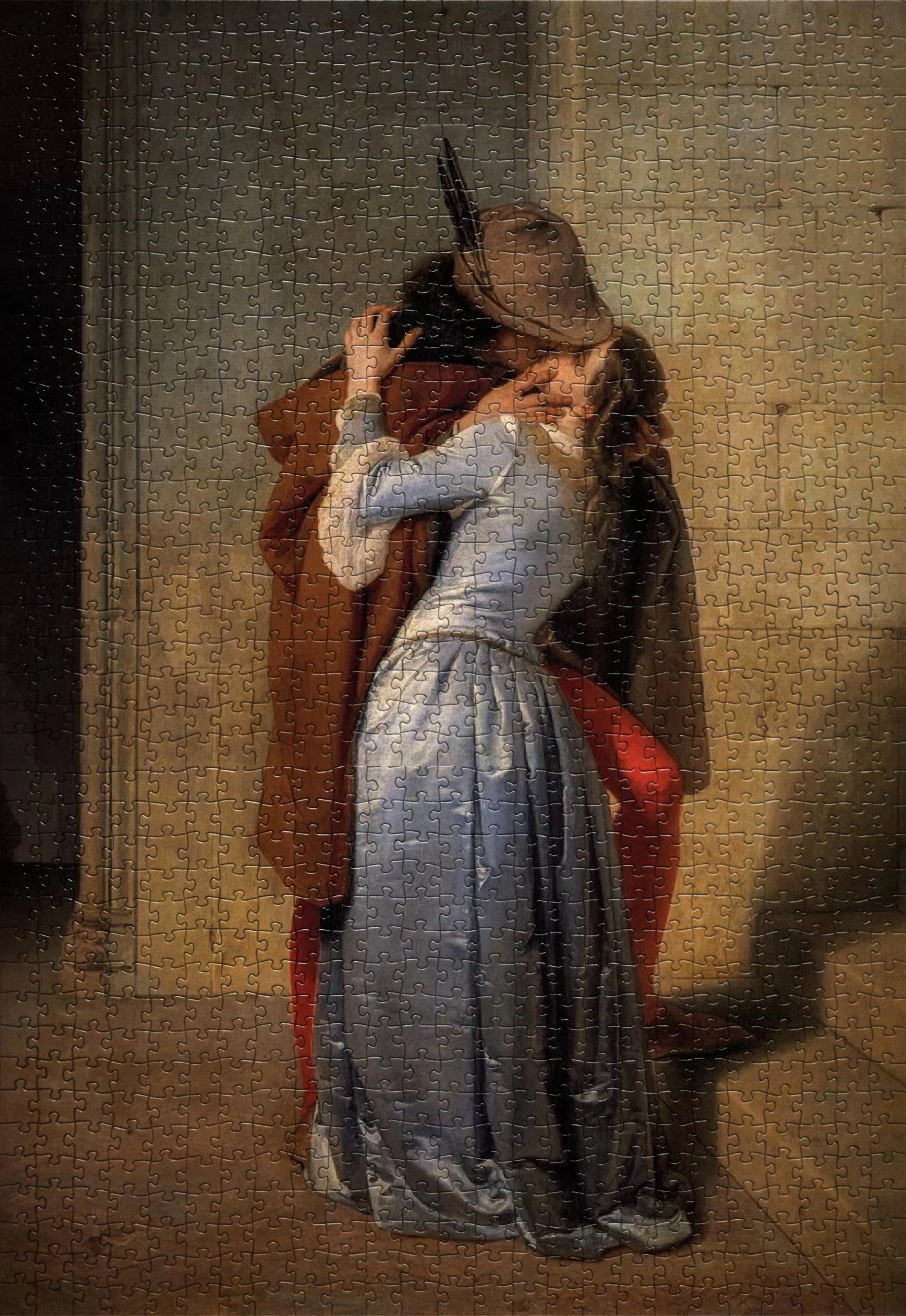 Before we talk puzzles, let us talk art โ because The Kiss is far more than a swooning romantic scene. Painted in 1859 by Milanese master Francesco Hayez, it is widely considered the defining work of Italian Romanticism. But here is where it gets deliciously subversive: beneath its tender exterior lies a blazing political statement. The painting was created in the year of Italian unification, and art historians believe the embrace symbolises the alliance between France and Italy against Austrian rule. The man's red trousers? A nod to Garibaldi's legendary Red Shirts. The shadowy figure lurking in the background? A reminder that this stolen kiss is happening in dangerous, revolutionary times. ๐ฎ๐น
